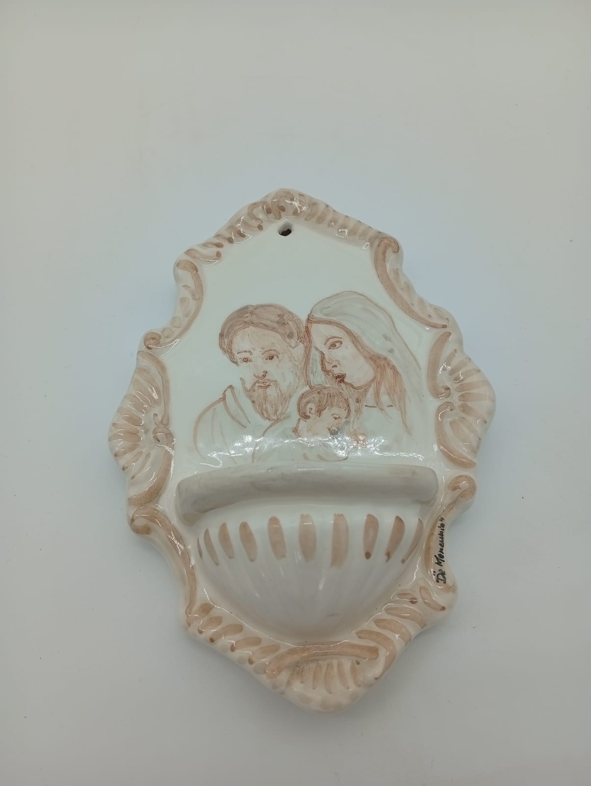 Acquasantiera in ceramica con decoro Sacra Famiglia interamente decorata a mano  Colore Tortora e Marroncino