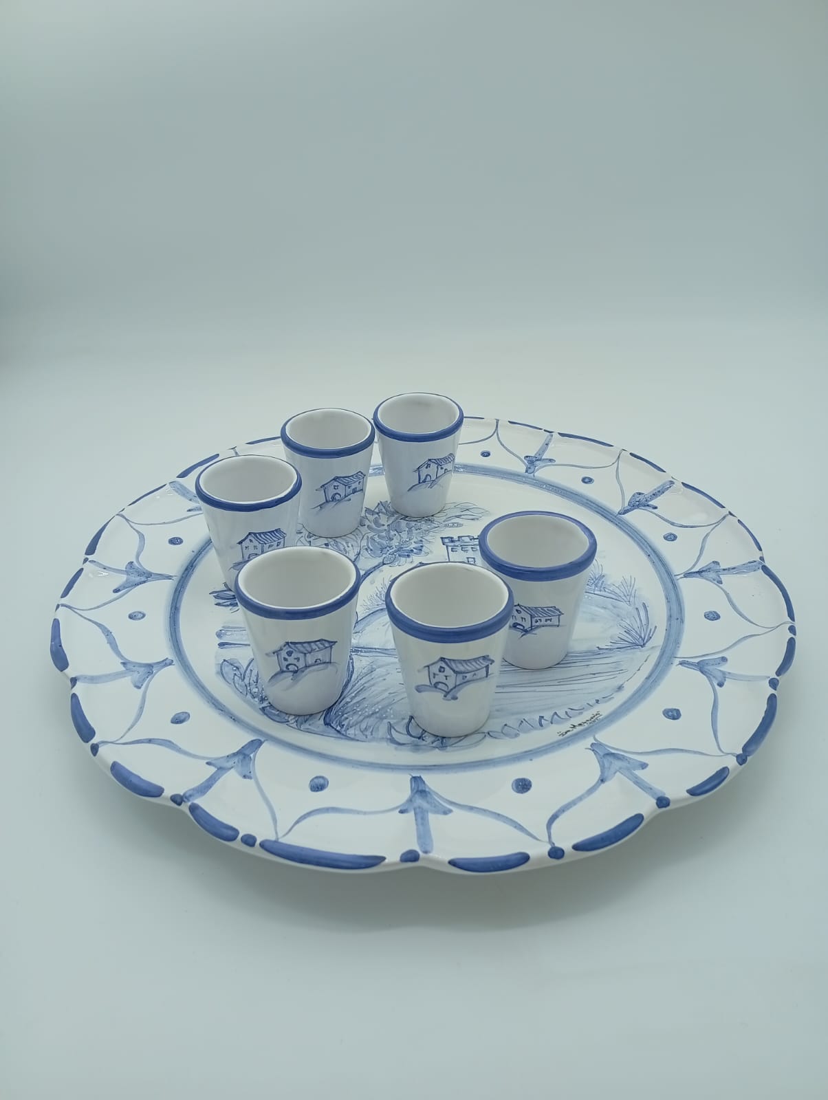 Servizio di limoncello 6 pz interamente decorato a mano decoro paesaggio blu faenza